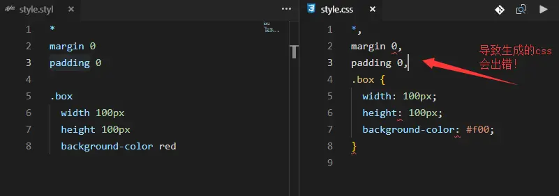 开始也说了,stylus的缩进有很重要的意义,stylus就是根据缩进来区别选择器和CSS样式,所以写完选择器后,下一行务必注意缩进 - 逗号