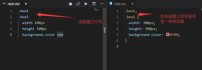 Stylus就和CSS一样,允许你使用逗号为多个选择器同时定义属性。 也可以省去逗号,一个选择器占一行写,可以达到同样的效果 - 嵌套