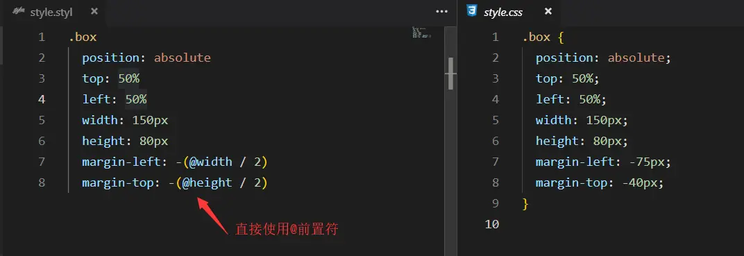 Stylus有另外一个很酷的独特功能,不需要分配值给变量就可以定义引用属性。下面是个很好的例子,元素水平垂直居中对齐(典型的方法是使用百分比和margin负值)
