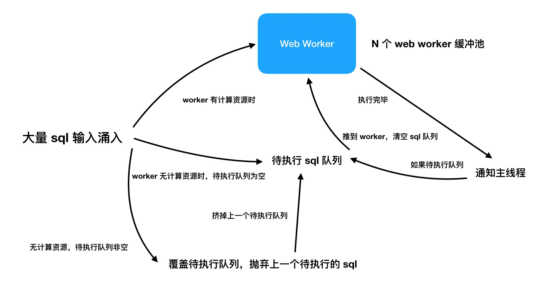 如上图所示,对于每次用户输入都要进行的 SQL Parser 很耗时,及时放在 Web Workers 也可能导致将 Workers 撑爆到无响应,这是不仅要使用多 Workers 缓冲池,还要对待执行队列进行过滤,因为用户永远只关心最后一次输入的 Parser 结果。