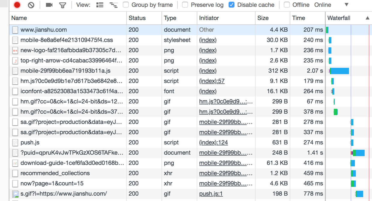 1、浏览器审查元素,关闭缓存等设置,查看请求的时间, 虽然打开一个网站会加载很多东西,但是有些是异步加载,在首页渲染的同时也在加载其他链接,也就是浏览器并行在发送请求,所以整体来看一些加载时间特别长的,可能并没有太影响用户体验。这里做测试是有disable cache 的,一般浏览器对一些资源做cache之后,响应会更快。