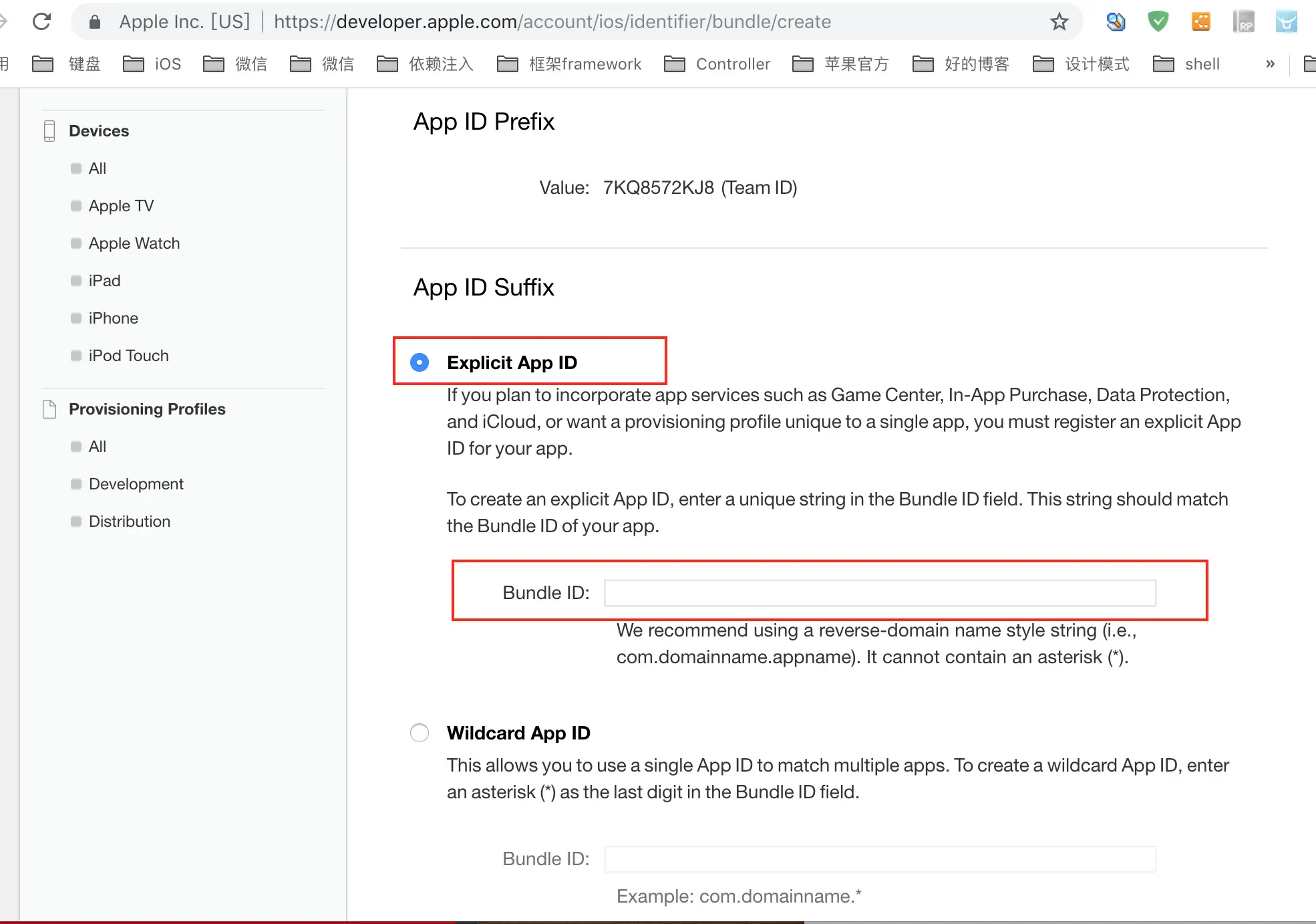 App ID Suffix-->Explicit App ID-->Bundle ID输入相应的bundle id