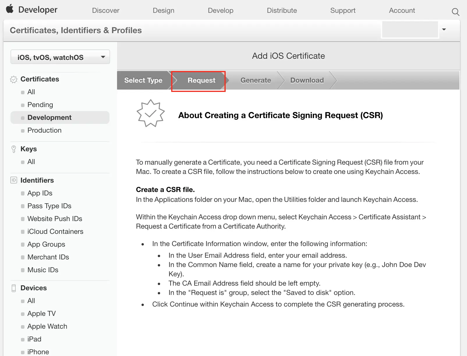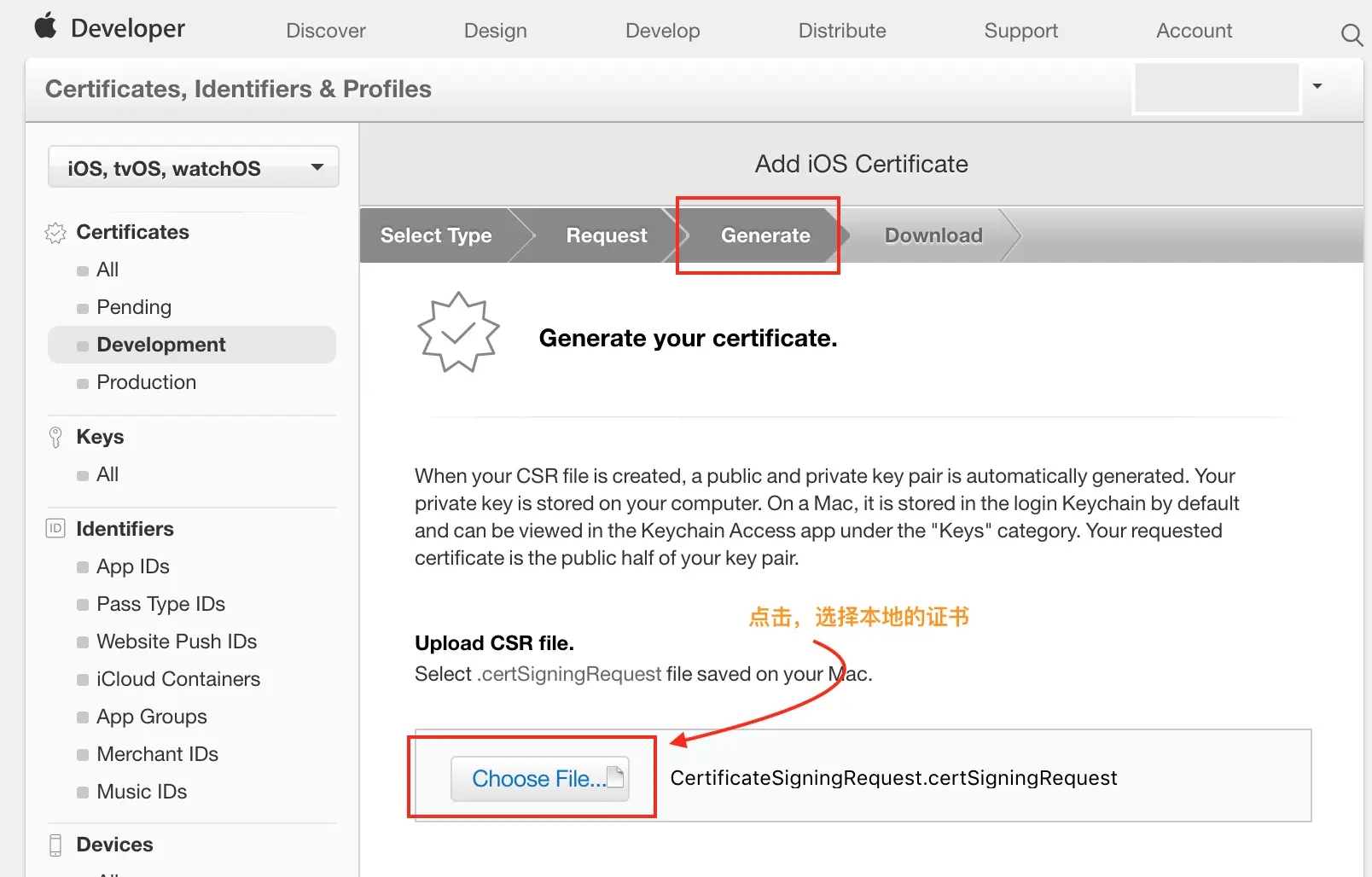 Cerfificates,Identifiers&Profiles-->Cerfificates-->Development - 点击右上角的
