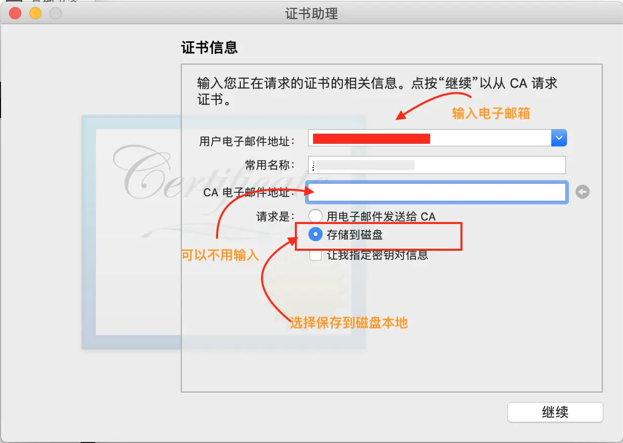 钥匙串访问-->证书助理-->从证书颁发机构请求...