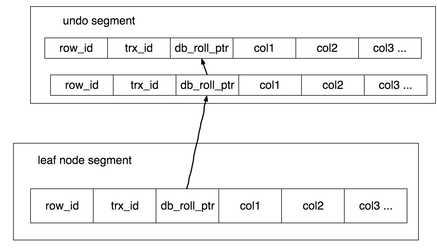 innodb中通过B+树作为索引的数据结构,并且主键所在的索引为ClusterIndex(聚簇索引), ClusterIndex中的叶子节点中保存了对应的数据内容。一个表只能有一个主键,所以只能有一个聚簇索引,如果表没有定义主键,则选择第一个非NULL唯一索引作为聚簇索引,如果还没有则生成一个隐藏id列作为聚簇索引。 除了Cluster Index外的索引是Secondary Index(辅助索引)。辅助索引中的叶子节点保存的是聚簇索引的叶子节点的值。 InnoDB行记录中除了刚才提到的rowid外,还有trx_id和db_roll_ptr, trx_id表示最近修改的事务的id,db_roll_ptr指向undo segment中的undo log。 新增一个事务时事务id会增加,trx_id能够表示事务开始的先后顺序。