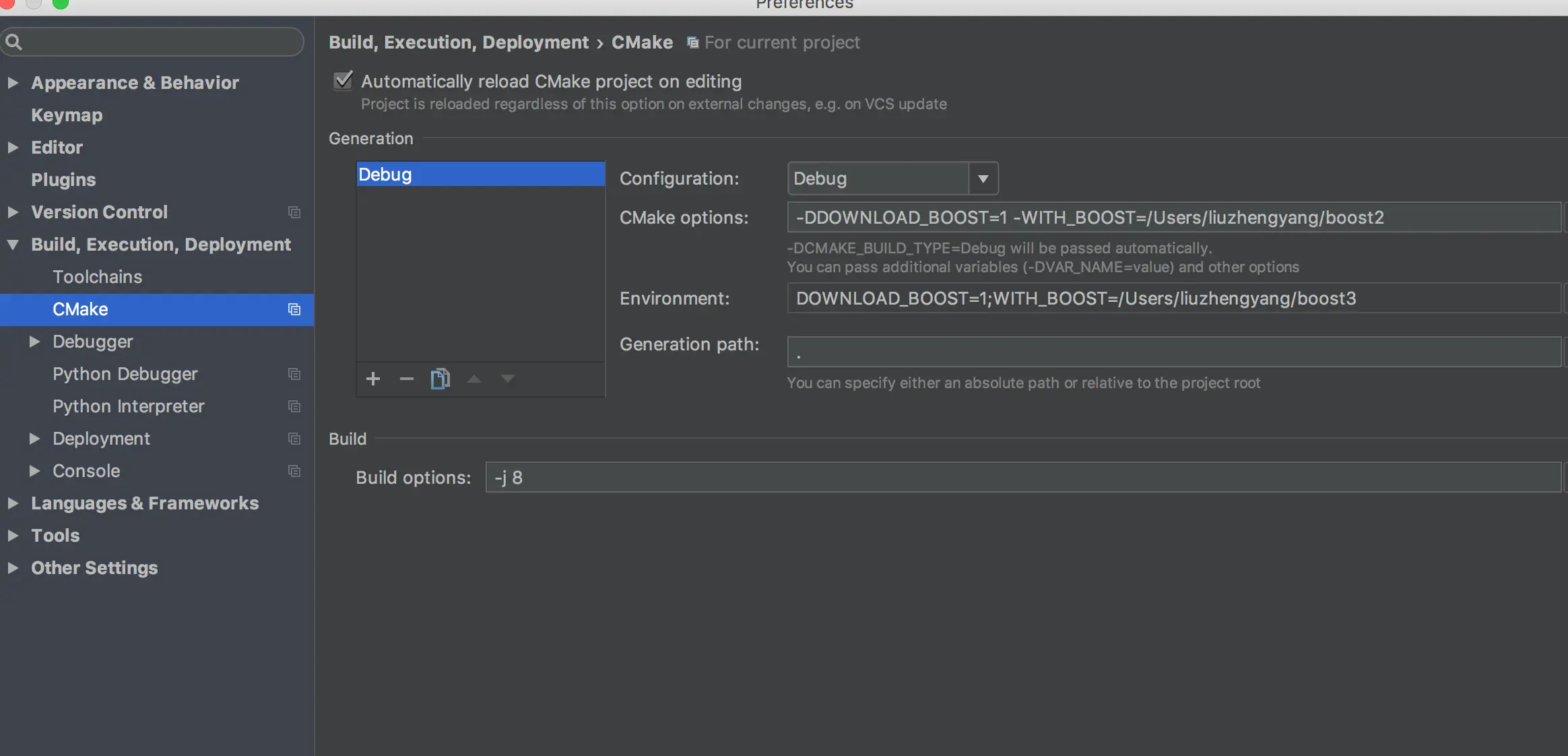 cmake .. -DWITH_DEBUG=1 -DDOWNLOAD_BOOST=1 -DWITH_BOOST=~/boost