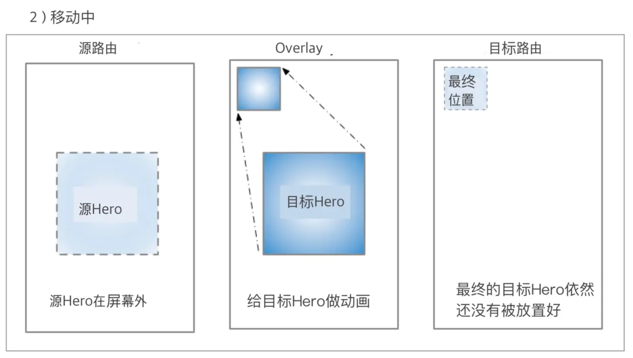 - 把源Hero复制一份,绘制到Overlay上(就是绘制一个与源Hero大小、位置完全相同的Hero,作为目标Hero),然后改变它的Z轴属性,让它能显示在所有路由之上;