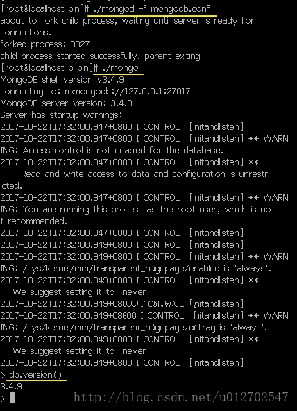 做完这一切之后,我们就可以启动MongoDB了,还是在bin目录下,执行./mongod -f mongodb.conf命令表示启动MongoDB,然后执行mongo命令表示表示进入到MongDB的控制台,进入到控制台之后,我们输入db.version()命令,如果能显示出当前MongoDB的版本号,说明安装成功了。如下: