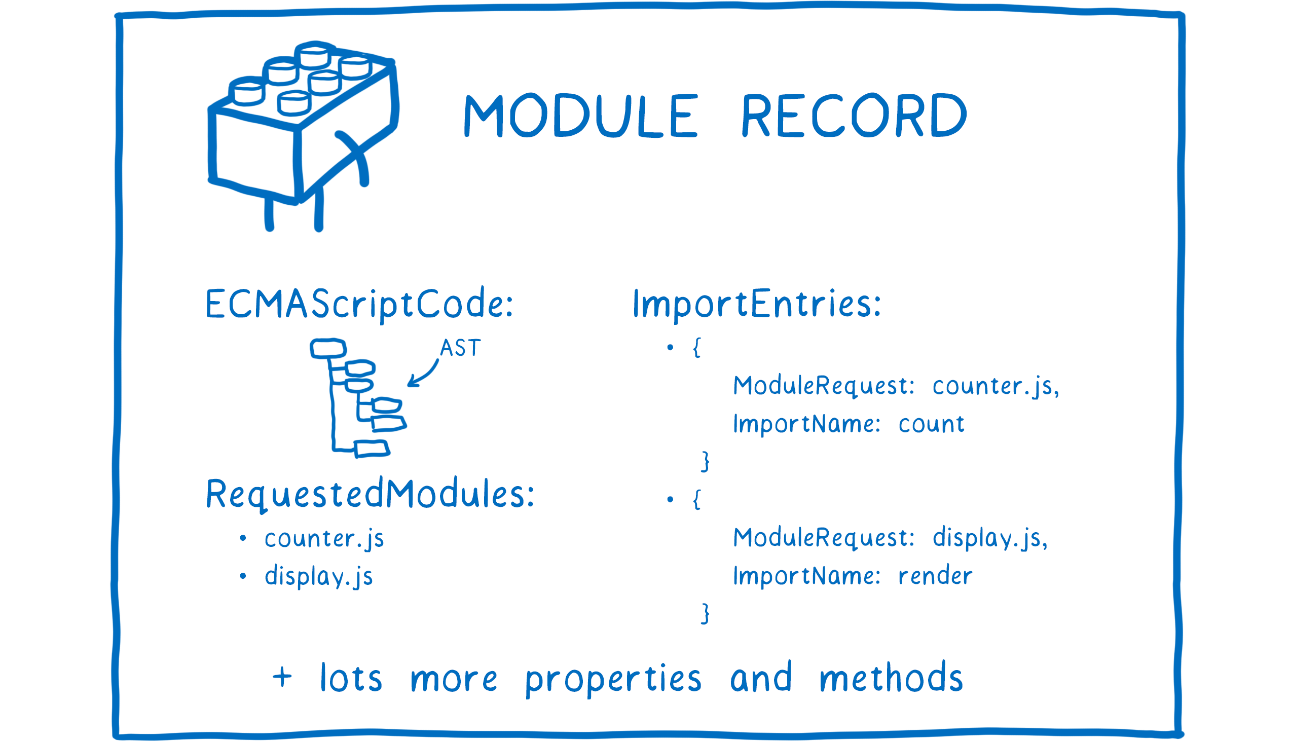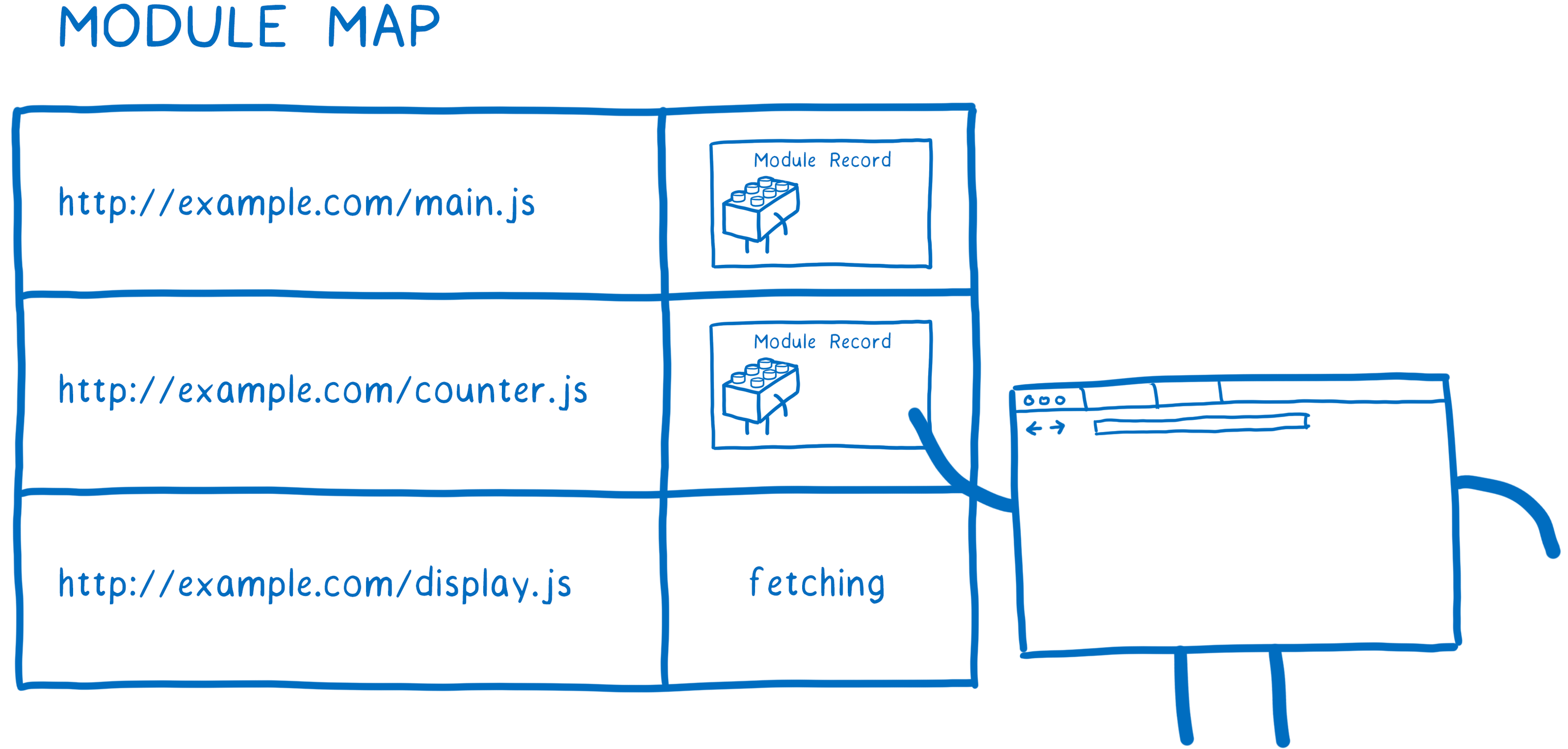 这个过程执行查找,下载,并将文件转化为模块记录 (Module record)。所谓的模块记录是指一个记录了对应模块的语法树,依赖信息,以及各种属性和方法 (这里不是很明白)。同样也是在这个过程对模块记录进行了缓存的操作,下图是一个模块记录表: