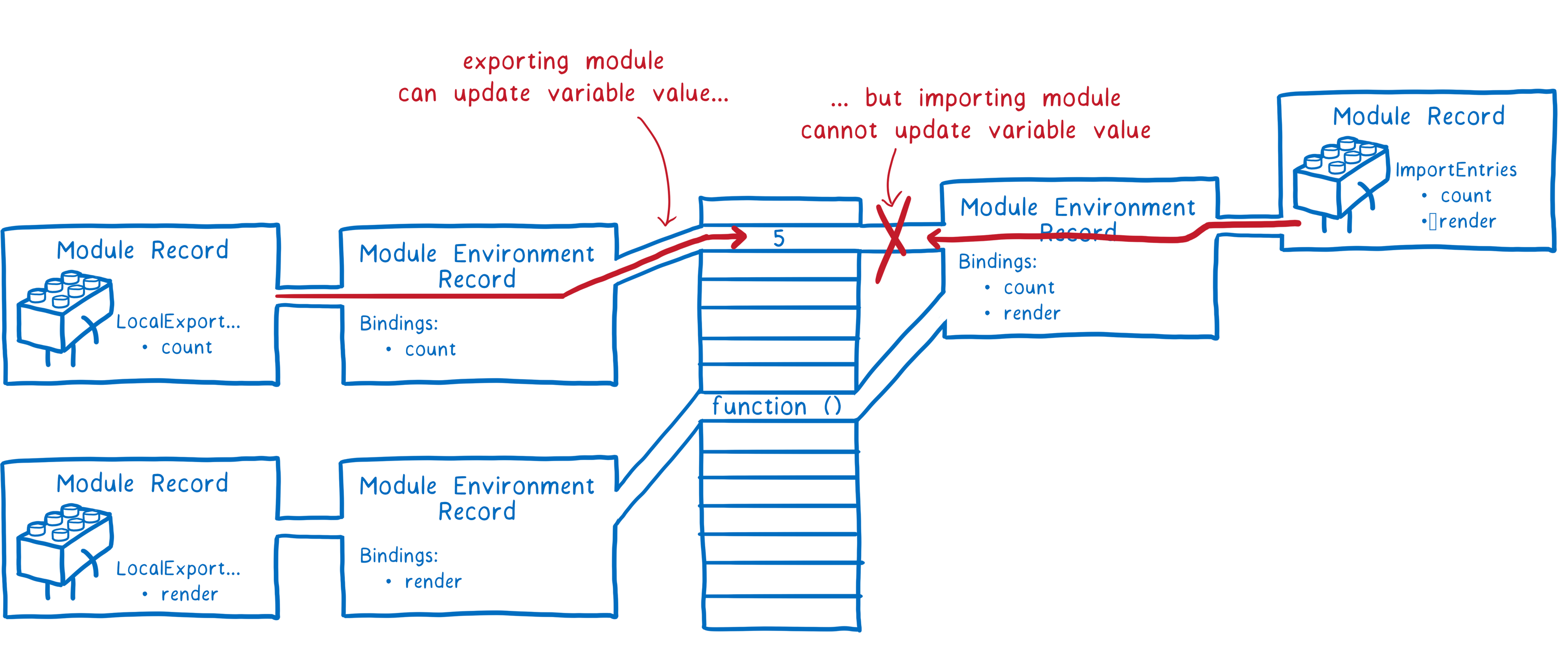 根据上面的过程我们可以知道。ES Module 模块 export 和 import 其实指向的是同一块内存,但有一个点需要注意的是,import 处不能对这块内存的值进行修改,而 export 可以,其示意图如下: