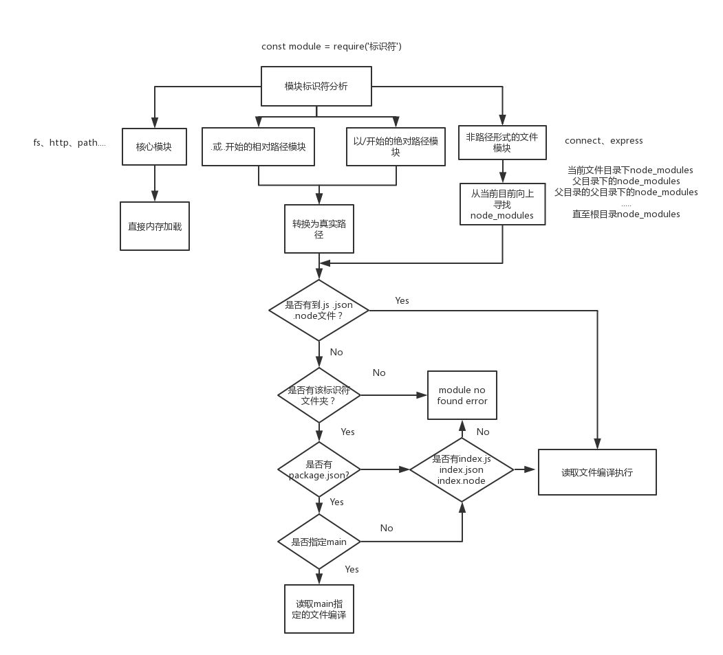 在 NodeJs 中引入模块 (require),需要经历如下 3 个步骤: