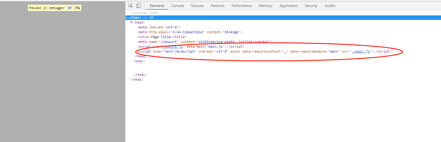 可以看出,这里主要是根据模块的 Url,创建了一个异步的 Script 标签,并将模块 id 名称添加到的标签的 data-requiremodule 上,再将这个 Script 标签添加到了 html 页面中。同时为 Script 标签的 load 事件添加了处理函数,当该模块文件被加载完毕的时候,就会触发 context.onScriptLoad。我们在 onScriptLoad 添加断点,可以看到页面结构如下图所示: