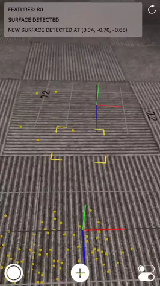 - 动图中右侧的黄色点是 3D 特征点。3D特征点就是处理捕捉到的图像得到的,能代表物体特征的点。例如地板的纹理、物体的边边角角都可以成为特征点。上图中我们看到当设备移动时,ARKit 在不断的追踪捕捉到的画面中的特征点。