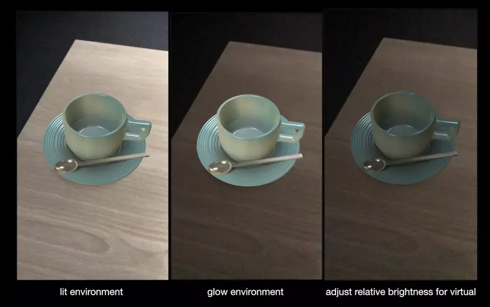 当周围环境光线较好时,摄像机捕捉到的图像光照强度也较好,此时,我们放在桌子上的茶杯看起来就比较贴近于现实效果,如上图最左边的图。但是当周围光线较暗时,摄像机捕捉到的图像也较暗,如上图中间的图,此时茶杯的亮度就显得跟现实世界格格不入。