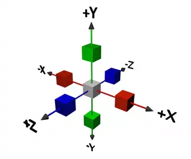 我们知道 UIKit 使用一个包含有 x 和 y 信息的 CGPoint 来表示一个点的位置,但是在 3D 系统中,需要一个 z 参数来描述物体在空间中的深度,SceneKit 的坐标系可以参考下图: