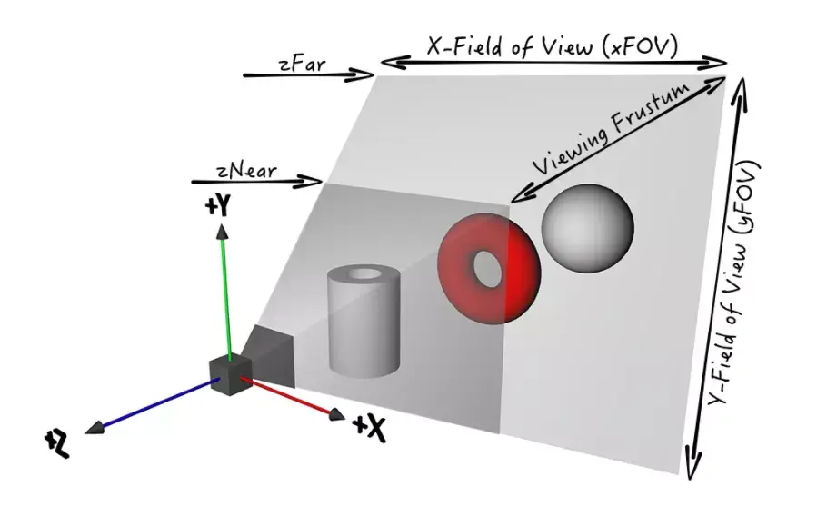 - 视锥体(Viewing Frustum)决定着摄像头可视区域的深度(z 轴表示深度)。任何不在这个区域内的物体将被剪裁掉(离摄像头太近或者太远),不会显示在最终的画面中。