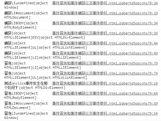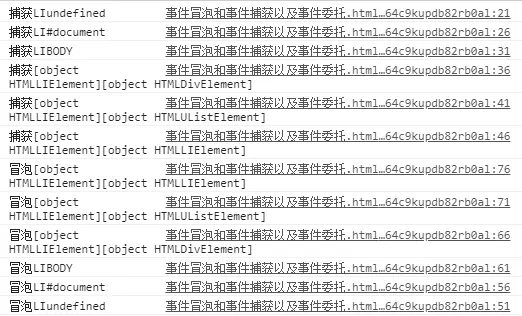 目标阶段:li事件发生了两次,因为在捕获阶段为其绑定了事件,在冒泡阶段也绑定了事件,所以发生了两次。note:处于目标阶段的事件不按照事件捕获-事件冒泡的顺序执行,而是按其绑定事件的顺序执行。