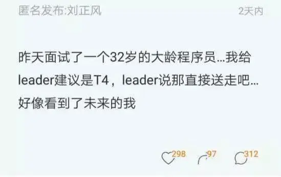 在某职场社交平台上看到一个帖子,楼主表示:面试了一个32岁的大龄程序员,自己给Leader的建议是T4,结果Leader说,那就直接送走吧……