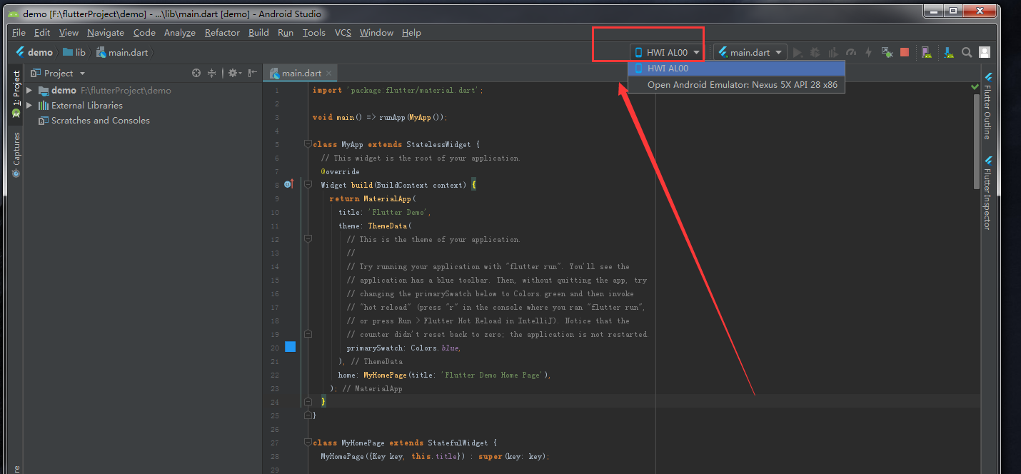- 选择连接设备(真机或模拟器),如果检测不到手机设备,可参考这篇文章进行配置(传送门)