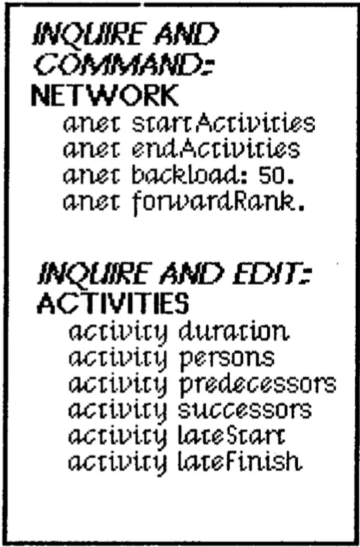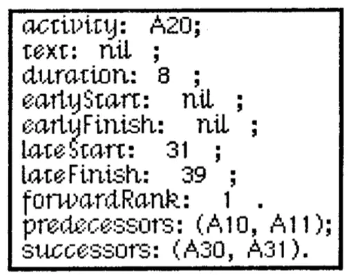 这种简单的抽象通常以某种方式扩展。基于活动的前置,很容易找到每个活动的后继者。网络最开始活动都是没有前置的活动,而结束活动是没有后继者的活动。其他信息可以被附加在每个活动上。例如活动的资源需求,以及与活动相关的成本和现金流。