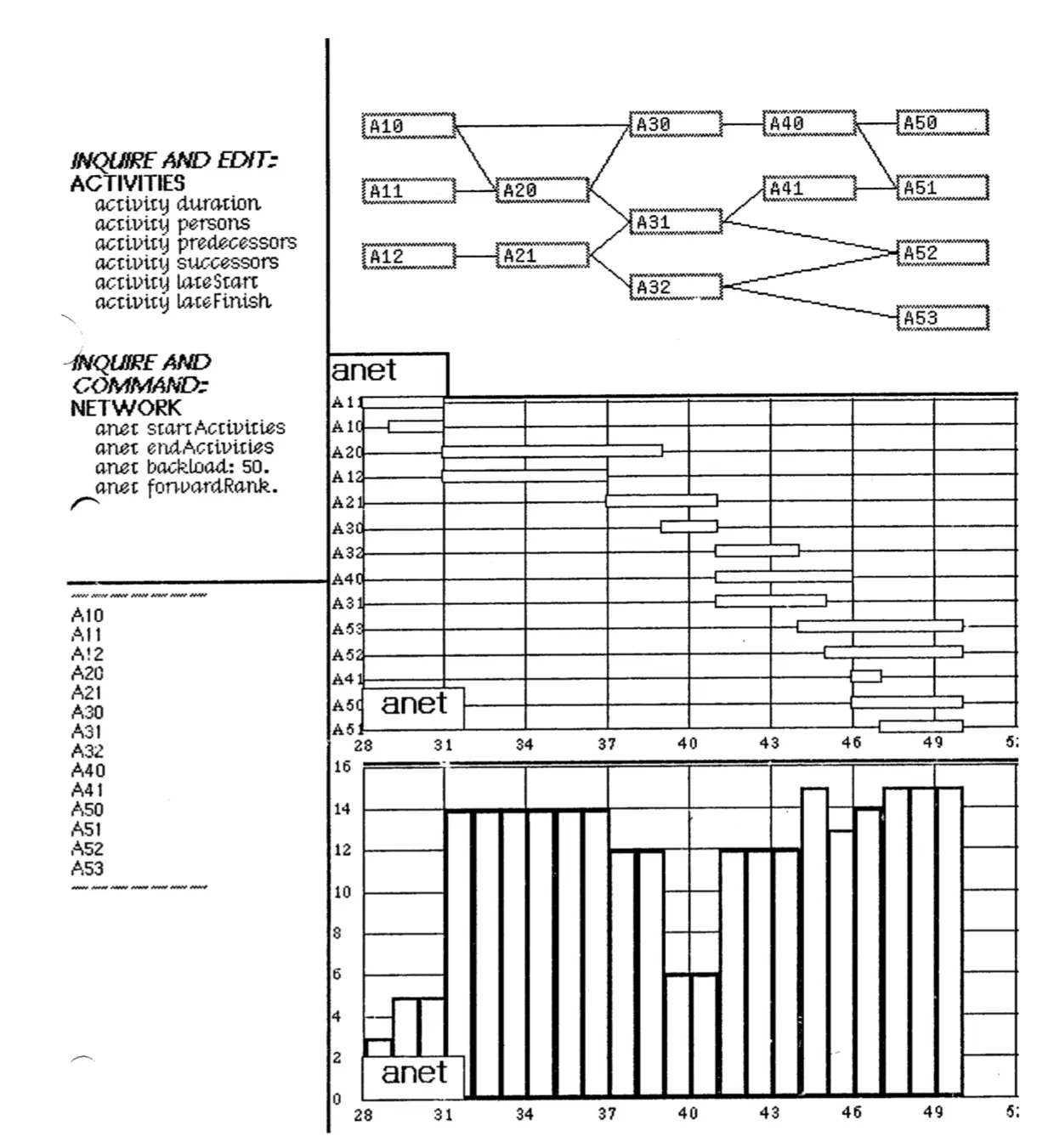 该图是类ResourceView的一个实例,它是DiagramView的另一个子类。关于甘特图的特性也适用于这一点,但选择的概念需要详细阐述。这个视图需要可以返回所有目标点的x坐标上所有需要资源的activity,还需要响应***选择***的消息:activity可以高亮其所需要的资源需求。对应的,最好将两者结合起来,并在所有NetworkModel View中设置多个选择的开关。