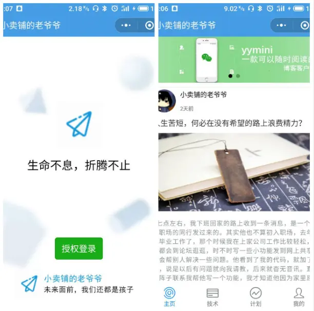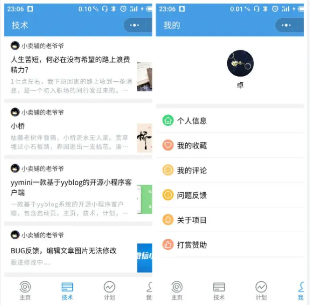 恰巧前段时间做了个练手的yyblog的开源项目,这次就拿这个项目做个简单的小程序客户端了。还是惯例,大家先看下效果图吧。