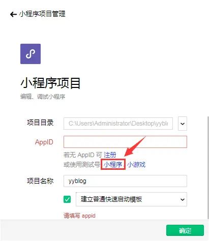 接下来我们首先新建个快速启动模板看一下,如果你有注册账号有appid的可以填入,没有的话也没关系。点击图中小程序即可使用测试账号。