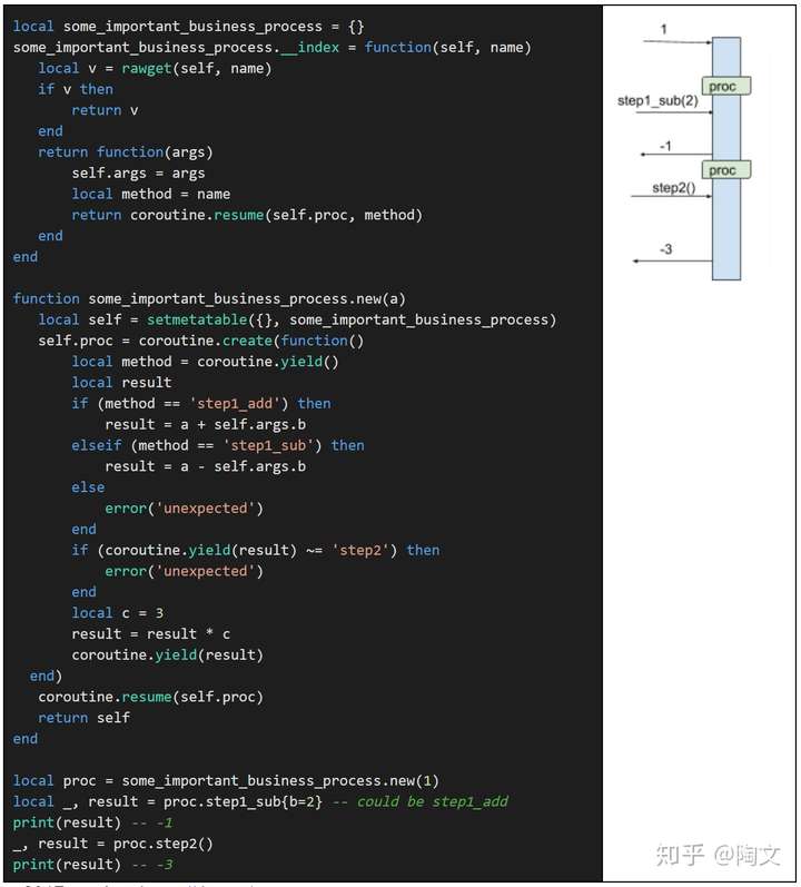 虽然我们添加了“step1“和”step2“这样的方法,但是并没有强制按照这样的顺序来调用。而且,如果我们要给”step1”定义两个选项怎么办?例如,既可能是“step1_add”也可能是“step1_sub”。让我们来把coroutine object升级为第2版。