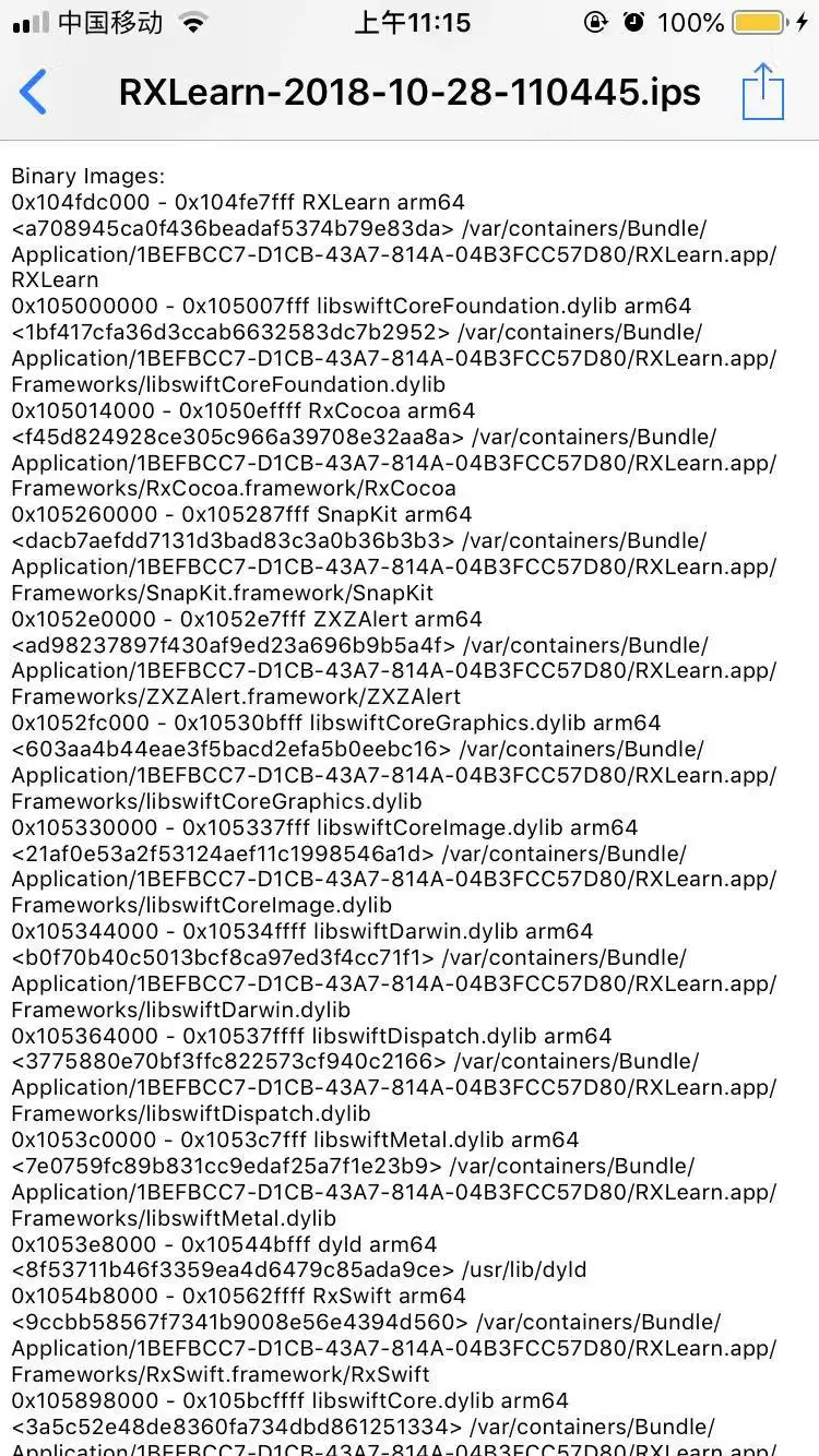 0x104fdc000 - 0x104fe7fff RXLearn arm64 <a708945ca0f436beadaf5374b79e83da> /var/containers/Bundle/Application/1BEFBCC7-D1CB-43A7-814A-04B3FCC57D80/RXLearn.app/RXLearn