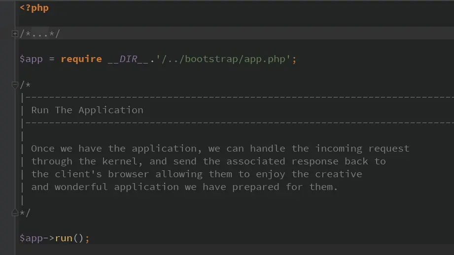 Laravel中的容器其实就是整个框架的核心,在上图的index.php中可以看到,一个Request进来后,index.php其实只是调用了$app->run()方法。