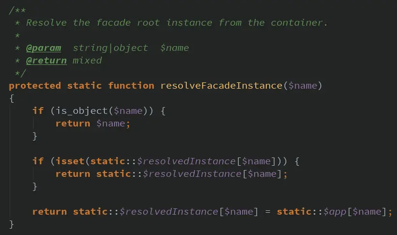 在前面的篇章我们讲到,当我们通过静态调用DB类的时候,Laravel的Facade模式就通过调用resolveFacadeInstance()去容器中解析出“db”的实际对象。