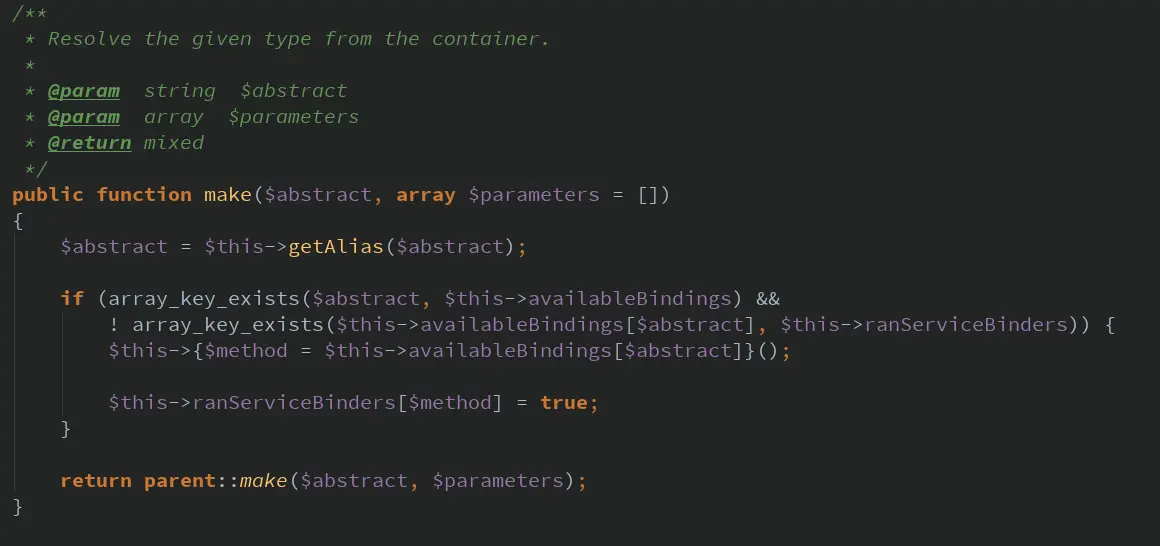 在make方法中,终于出现了前面说到的$availableBindings,也就是说,在这里会调用前面的registerDatabaseBindings()方法,注册“db”的解析器。再进行调用父类,也就是Container的make()方法。