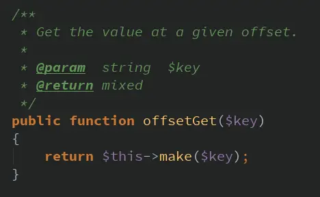 因为Laravel中的Container实现了ArrayAccess,所以实际调用会进入到Container的offsetGet()方法中,也就是进入了make()方法,而因为容器的实际对象是Application类,所以会先进入Application的make()方法。