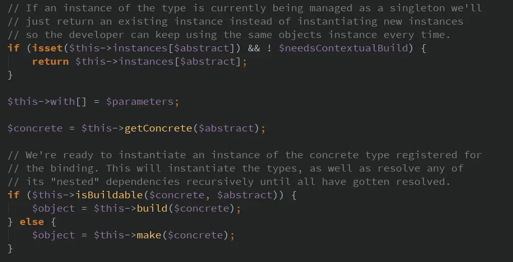 在resolve()这里,容器会先去$this->instances中查找,也就是一个用于存放已实例化的对象的数组。