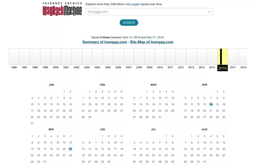 比如:我之前有两个自己的独立博客,一个是 loonggg.com ,一个是 godcoder.me ,而 loonggg.com 这个独立博客已经好久不用了,已经不复存在了,但是我在互联网档案馆里搜了一下,它曾经在 2016 年的时候,有过两次保存我博客的内容。如下: