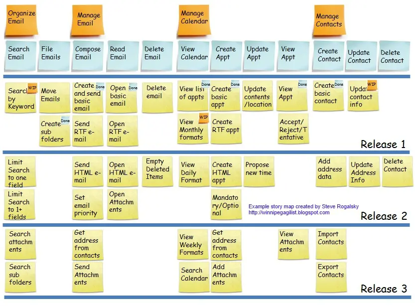 为了更好地对用户故事进行规划,敏捷中使用 故事地图(User map)作为故事管理方式。故事地图会将产品的backlog从简单的列表模式变为一张二维地图,从而能容易地看到整个产品规划的全貌,不仅能帮助业务人员整理产品需求,协助开发人员更快速便捷地了解客户的需求,同时还能够确定产品模块的实现优先级,实现最大用户价值。