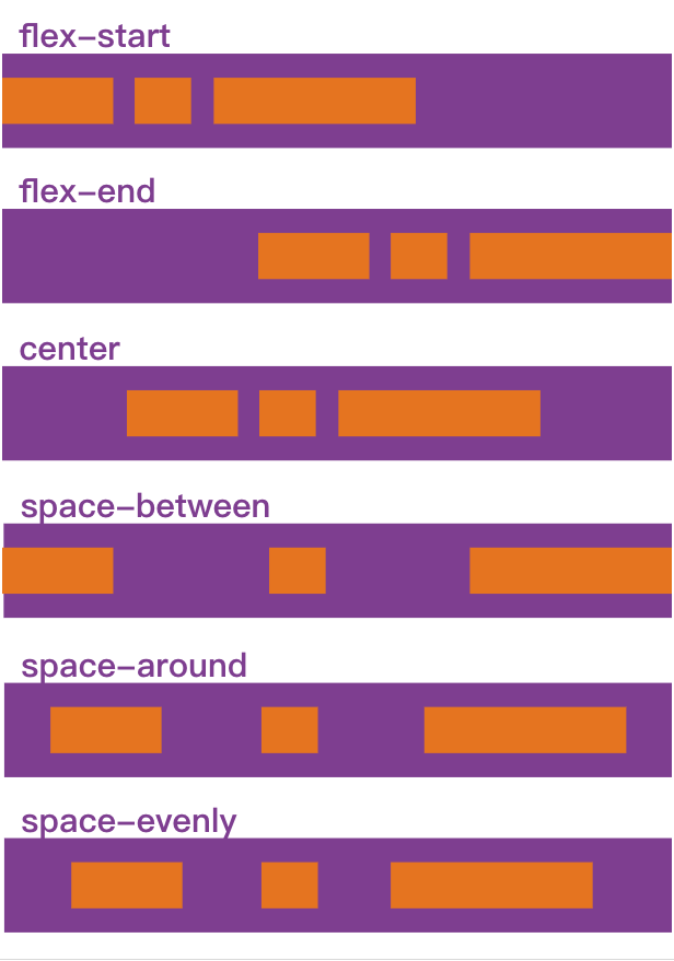 justify-content: 这个属性就是决定主轴方向排列方式的,水平居中,等间隔排列都可以用它来实现,应用的比较多,有6个值:- flex-start(默认):左对齐