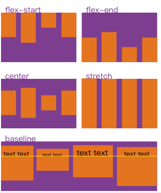 align-items: 这个属性决定交叉轴方向的排列方式,可以很方便地实现垂直居中,也有5个值,以从上到下的垂直方向为交叉轴方向:- flex-start: 上对齐