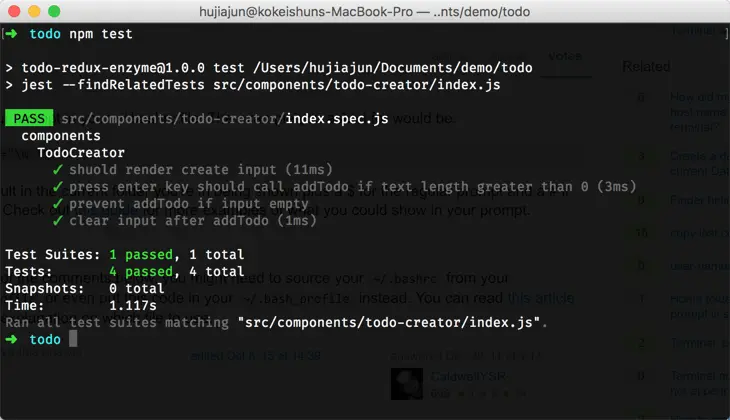 再次,我们执行npm test会“无感”的看到case通过。为了再次验证结论,我们把初始化todo的 text 改为’Todo1’,我们再试一遍: