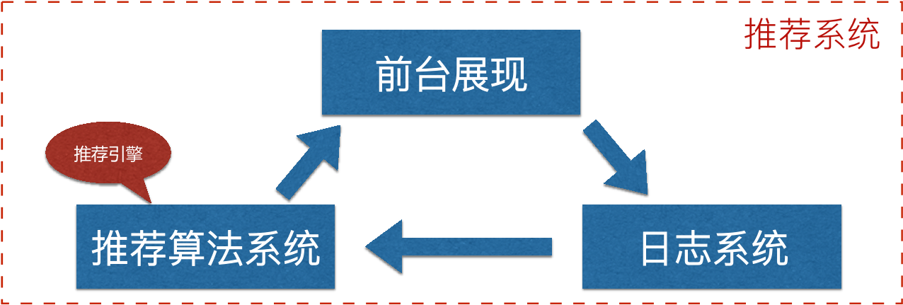 推荐服务通常由三部分组成:日志采集,推荐计算和产品对接。推荐服务首先需要采集产品中记录的用户行为日志到离线存储,然后在离线环境下利用推荐算法进行用户和物品的匹配计算,找出每个用户可能感兴趣的物品集合后,将这些预先计算好的结果推送到在线存储上,最终产品在有用户访问时通过在线API向推荐服务发起请求,获得该用户可能感兴趣的物品,完成推荐业务。