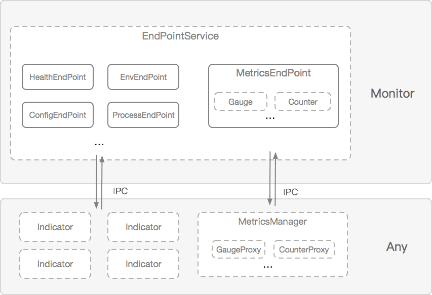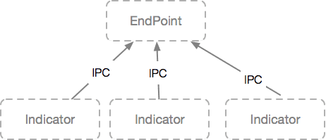 在 Pandora.js 的设计中,我们参考了 spring-boot 的命名习惯,将数据披露的客户端称为 Indicator,每个 Indicator 都会连接到对应的服务端 EndPoint 中,这其中是多对一的关系。