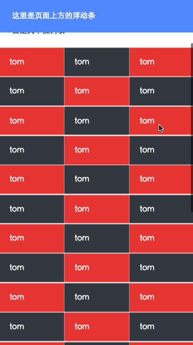 如果页面中有部分是固定的其余部分可以滚动我们可以采用如下方式,这种场景通常用来作为顶部导航或者底部 bar。