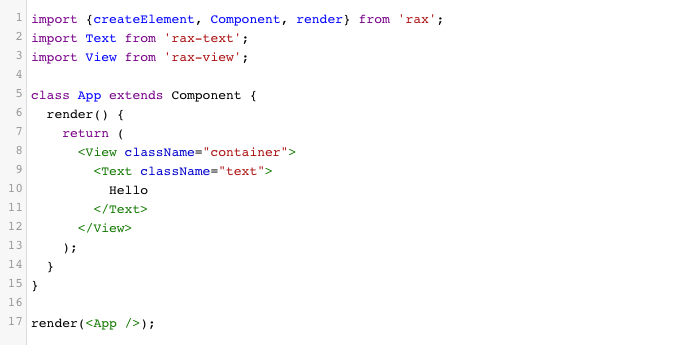 熟悉 React 的同学一定对 JSX 不陌生,Rax 的 DSL 语法是基于 React JSX 语法而创造。与 React 不同,在 Rax 中 JSX 是必选的,它不支持通过其它方式创建组件,所以学习 JSX 是使用 Rax 的必要基础。