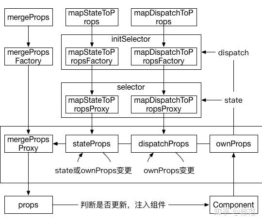 selector 筛选器注入组件的 props 有两种:store 中存储的状态值、驱动状态值变更的方法 boundAction(包含 store.dispatch 方法)。这两份数据分别通过用户配置项 mapStateToProps, mapDispatchToProps 获得,再由用户配置的 mergeProps = (stateProps, dispatchProps, ownProps) => props 获取注入组件的 props(ownProps 是由父组件注入自定义组件的 props)。