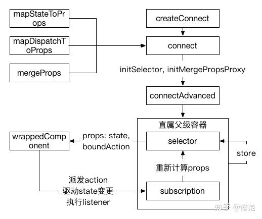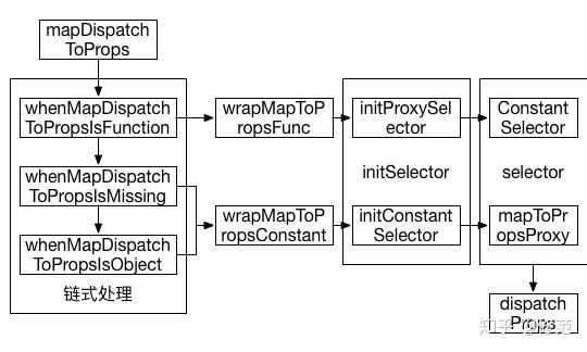 - 将前两步的处理逻辑复合为 mapStateToPropsFactory = mapStateToProps => initSelector, mapDispatchToPropsFactory = mapDispatchToProps => initSelector,可在构建父级直属容器时直接使用。返回值 initSelector = (dispatch, options) => stateOrDispatchSelector 通过父级指数容器获得入参 store.dispatch,并生成 stateOrDispatchSelector = (stateOrDispatch, ownProps) => props 。stateOrDispatchSelector 用于获得注入组件的 props,在源码中实际表现为 mapStateToPropsProxy, mapdispatchToPropsSelector。