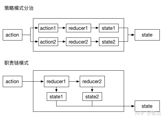在 redux 中,函数 state = fn(state, action) 被称为 reducer。与 Array.prototype.reduce(arrReducer, result) 方法相同的是,在数组的原型方法中,result 的终值通过递归调用 arrReducer 获得;redux 中的 state 更新也是通过逐个调用 reducer 函数实现。如果我们把采用策略模式分而治之的示例代码转变为采用职责链模式实现,即 childState = fn(childState, action) 替换为 state = fn(state, action) 函数,传入 reducer 中的为全量 state 数据,多个 reducer 构成链式结构,当前一个执行完成后,再执行下一个,这样就更接近于 Array.prototype.reduce 方法的执行机制,我们也就更能看出更新状态的函数为什么会被叫做 reducer 了。