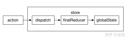 如果我们把总 reducer 称为 finalReducer,全局状态称为 globalState,派发 action 的过程其实只在于唤起 finalReducer 的执行。在 redux 源码中,无论 finalReducer,还是 globalState,都在 store 中维护。store 的执行机制就如下图所示: