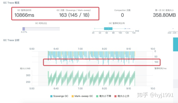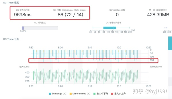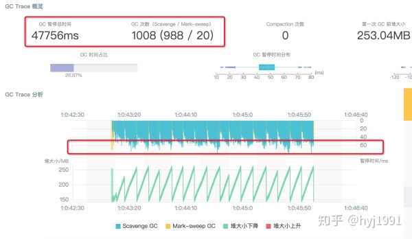 因此很自然的,我们会把进一步提升项目性能的目光放到 GC 阶段。这里在 3min 的 CPU 采样期间,GC 阶段的调用占比高达 27.5%,结合当时的性能平台监控数据,我们可以看到绝大部分都是 scavenge 阶段,此时继续进行线上压测,同时做 GC Trace 来获取更多 GC 阶段的详细信息: