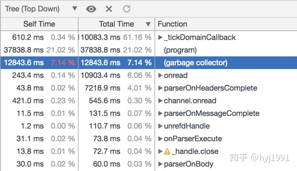 可以看到 _tickDomainCallback 和 garbage collector 在 CPU 的占比加起来高达 83%,而经过和用户沟通,发现 _tickDomainCallback 内部的耗费 CPU 高的逻辑分别是 typeorm 和自己的 controller 逻辑,typeorm 方面因为 api 变动的原因不太方便升级,controller 逻辑则是已经优化过了暂时没有提升的空间。