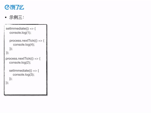 });js按照从上到下的执行顺序,将setImmediate排列到node事件环的I/O callbacks队列中,process.nextTick排列到微任务队列。首先检查执行栈,发现没有任务,然后检查微任务队列并执行清空,输出2,并将setImmediate排列到I/O callbacks队列,检查timers队列,发现并没有任务,继续检查I/O callbacks队列,发现有任务,执行清空,输出1,将process.nextTick排列到微任务队列,继续执行,输出3,最后将微任务清空,输出4。